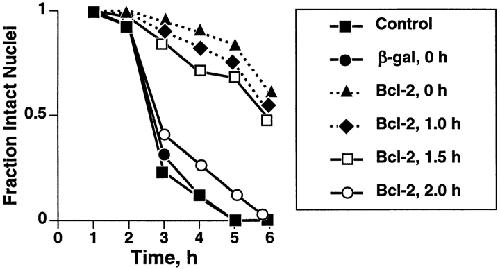Figure 6. The Bcl-2 protein acts later in the apoptotic process, after ∼1.5 h of incubation. Lysates from Sf9 cells (0.01 vol, as described; 29) infected with Bcl-2 baculovirus or, as a control, β-galactosidase baculovirus were added at the indicated times after the start of incubation. Note that Bcl-2 is much less effective when its addition is delayed at least ∼2 h after the start of incubation.