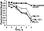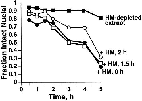 Figure 7. The heavy membrane (HM) fraction is required relatively late in the apoptotic process. Percoll-enriched HMs (29) were added at the indicated times. Note that only when the HMs were added at least 2 h after the start of incubation was there any significant delay in the kinetics of nuclear destruction.