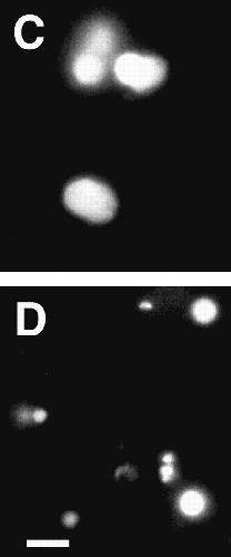 Figure 9. CPP32-like protease activity is required for apoptosis in the Xenopus system. The crucial proteolytic event occurs ∼1.5–2 h after the start of incubation. (A) The tetrapeptide inhibitors, AcDEVD-CHO (DEVD) and Ac-YVAD-CHO (YVAD), were added to the extract from the start of incubation at the concentrations indicated. Nuclear survival was quantitated at various times. (B) The experiment was performed as above, except that DEVD (100 μM) was added at the indicated times. Note that the inhibitor lost its effect only when added after ∼2 h of incubation. (C and D) Fluorescence photomicrographs of rat liver nuclei placed in apoptotic extract, incubated for 3 h in the presence (C) or absence (D) of 10 μM DEVD. Bar, 10 μM.