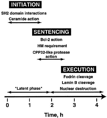 Temporal phases in apoptosis defined by the actions of Src homology 2 domains, ceramide, Bcl-2, interleukin-1beta converting enzyme family proteases, and a dense membrane fraction.
