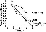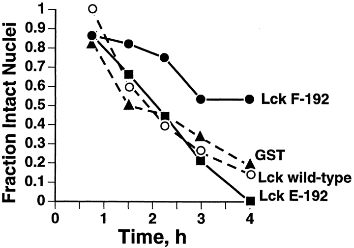 Figure 2. Effect of wild-type and mutant SH2 domains from Lck. The experiment was performed as in Fig. 1. GST–SH2 domain fusions were added at 100 nM. Note that the wild-type (Y192) Lck SH2 domain is unable to inhibit apoptosis, as is the E192 mutant, which mimics the phosphorylated form of Y192. However, the F192 mutant, which mimics the unphosphorylated form of Y192, inhibits apoptosis in the extract.