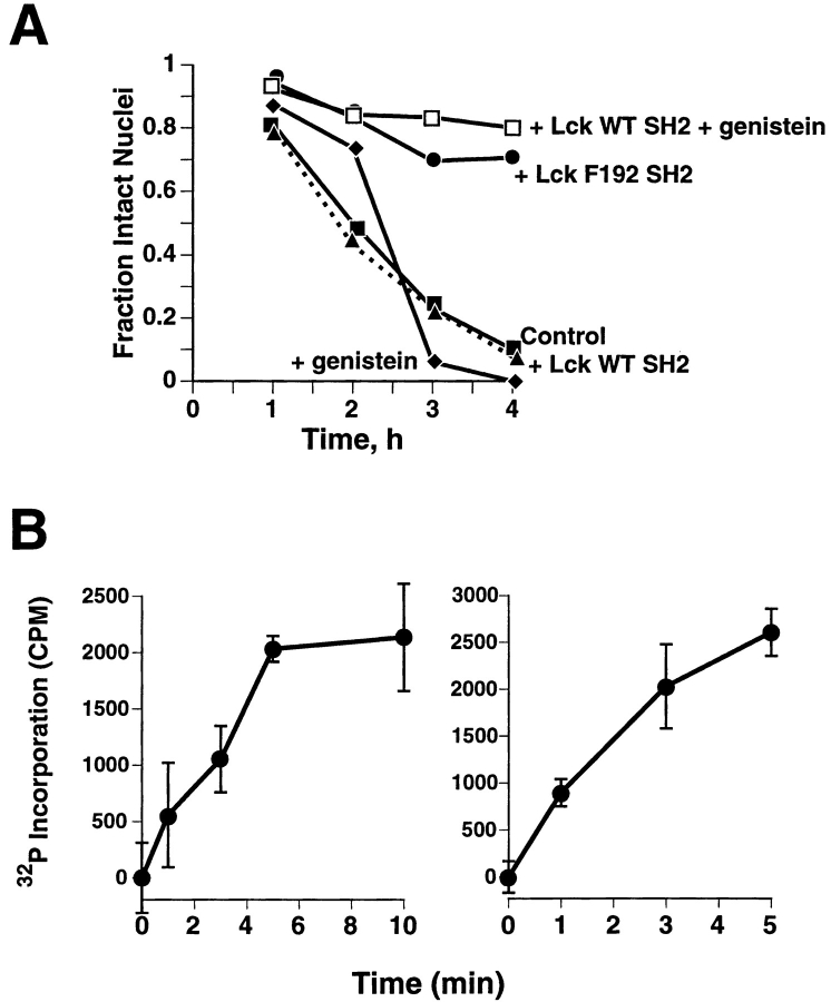 Figure 3. The wild-type Lck SH2 domain is inactive in the extract because it becomes phosphorylated. (A) Genistein, an inhibitor of tyrosine kinases, restored the ability of the wild-type Lck SH2 domain to inhibit apoptosis. The experiment was done as in Fig. 2, except that genistein (10 μM) was added to the indicated samples either separately or along with the wild-type (WT) Lck SH2 domain–GST fusion (100 nM). (B) A kinase in the Xenopus egg extract can phosphorylate a synthetic peptide corresponding to the site surrounding Y192 in Lck. The peptide (RNLDNGGFYIAPR) was incubated in a buffer containing γ-[32P]ATP and Xenopus egg extract (diluted as described in Materials and Methods) for the times indicated, and the incorporated radioactivity was assayed (see Materials and Methods). Two separate experiments are shown.