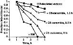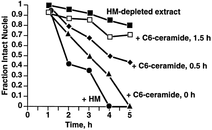 Figure 8. Ceramide acts early in the cell-free apoptotic process. A progressive loss of activity occurs when the addition of ceramide (150 μM) is delayed 0.5–1 h.
