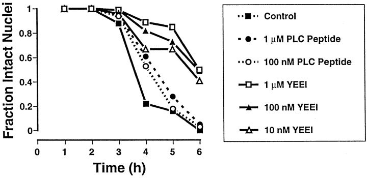 Figure A1. Comparison of SH2 ligand peptides with regard to their effects on the Xenopus cell-free apoptosis system. The experiment was done as in Fig. 4, except that either the YEEI peptide, or a synthetic peptide corresponding to the SH2 ligand domain of phospholipase C (PLC)-γ1 surrounding Y1021 (PLC peptide, DNDY*IIPLPDPK; 35) was added to the system at the indicated concentrations before incubation. Note that the PLC-γ1 peptide had no significant inhibitory activity in this system.
