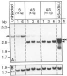 the antisense treatment gives rise to a band of 2.9 kb (double arrowhead)