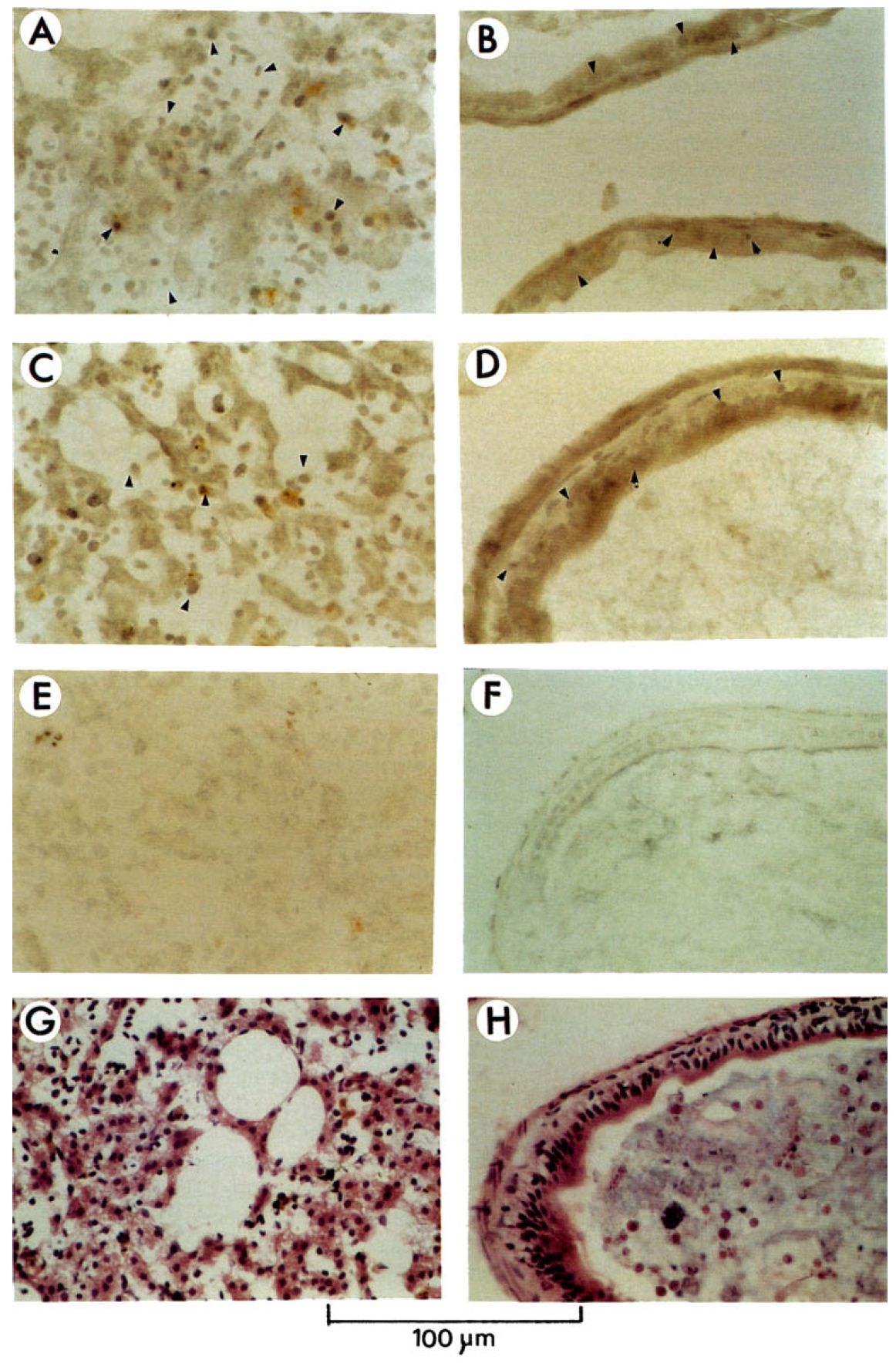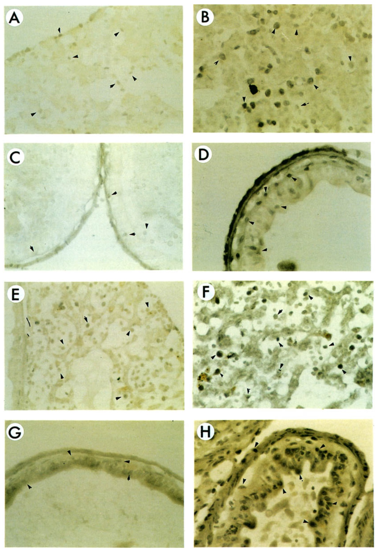 immunocytochemical localization of xTRB; (b,d,f,h) histochemical staining. Arrowheads indicate spatially restricted dense pockets of