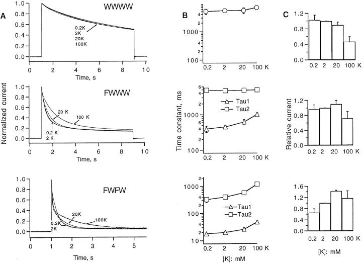 The mutation W434F produces an apparently complete block of potassium current in Shaker channels expressed in Xenopus oocytes. Tandem tetrameric constructs containing one or two subunits with this mutation showed rapid inactivation, although the NH2-terminal inactivation domain was absent from these constructs. The inactivation showed a selective dependence on external cations and was slowed by external TEA; these properties are characteristic of C-type inactivation. Inactivation was, however, incompletely relieved by hyperpolarization, suggesting the presence of a voltage-independent component. The hybrid channels had near-normal conductance and ion selectivity. Single-channel recordings from patches containing many W434F channels showed occasional channel openings, consistent with open probabilities of 10(-5) or less. We conclude that the W434F mutation produces a channel that is predominantly found in an inactivated state.