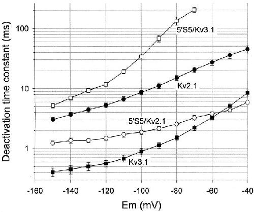 Figure 2. Voltage dependence of deactivation rate. Deactivation time constants were obtained by fitting the tail currents to monoexponential decay functions and were plotted semilogarithmically versus test potential: Kv2.1 ( filled circles), 5′S5/Kv2.1 (open circles), Kv3.1 ( filled squares), or 5′S5/Kv3.1 (open squares). The first 0.3 ms of the tail current was ignored during curve fitting to avoid limitations imposed by the clamp settling time. Each symbol represents average data from 5–10 membrane patches. |