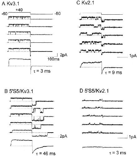 Figure 3. Effects of S5 mutations on single channel tail currents. Single-channel currents in Kv3.1 (A), 5′S5/Kv3.1 (B), Kv2.1 (C), and 5′S5/Kv2.1 (D) were recorded from cell-attached patches and the ensemble averages of 300–500 traces (except 5′S5, 128 traces). The patch membrane was pulsed to +40 mV for 200 ms and then returned to the holding potential of −80 mV. Pipette solution containing 60 mM NaCl and 60 mM KCl, and oocytes were bathed in a depolarizing isotonic KCl solution. |