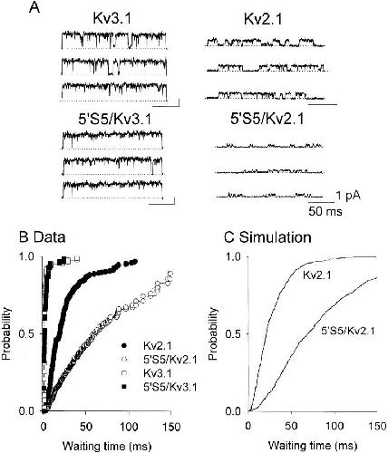 Figure 4. Cumulative first latency distributions. First latency distributions were obtained at +40 mV by patch-clamp single channel recording in the cell-attached mode. (A) Shows representative records in Kv3.1, 5′S5/Kv3.1, Kv2.1, and 5′S5/Kv2.1 channels. Pipette solution was normal Ringer containing 120 mM NaCl, and 2.5 mM KCl. Oocytes were bathed in a depolarizing isotonic KCl solution. (B) Shows the cumulative distribution of first latencies (from the representative experiments in A) at test potential +40 mV: Kv3.1 (open squares), 5′S5/Kv3.1 ( filled squares), Kv2.1 (f illed circles), and 5′S5/Kv2.1 (open circles), respectively. All data were obtained from single channel patches except 5′S5/Kv2.1 (3–8 channels/patch estimated from the maximum number of overlapping open channel events). These data were corrected (Aldrich et al., 1983) by taking the Nth root of the cumulative distribution (expressed as a survivor function, where N = 4, the estimated number of channels/patch in this experiment). As discussed in the text, because of the low Po of this mutant channel, the correction underestimates the slowing effect. (C) Compares the first latency distributions for Kv2.1 and 5′S5 obtained from the kinetic model described in Fig. 6. |