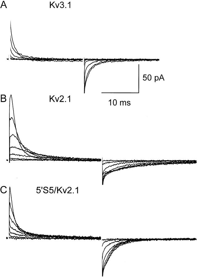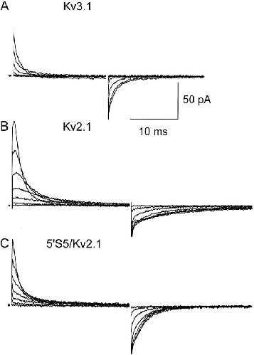 Figure 7. Gating currents measurements. Nonlinear capacitative currents in Kv3.1 (A), Kv2.1 (B), and 5′S5/Kv2.1 (C) were recorded in inside-out patches in the absence of permeant cations (NMG and TEA, respectively, were substituted in the internal and external solutions). The traces illustrate typical recordings obtained at test pulse potentials of −60 to +60 mV (20-mV increments) for Kv3.1, or −80 to +40 mV (20-mV increments) for Kv2.1 and 5′S5/Kv2.1 were applied from a holding potential of −90 mV. Linear components of the leak and capacitative currents were subtracted on-line using a P/−4 protocol (subtraction holding potential = −100 mV). No signal averaging was used. In A and B the first 0.3 ms of the ON and OFF transients are blanked because of imperfect subtraction. |