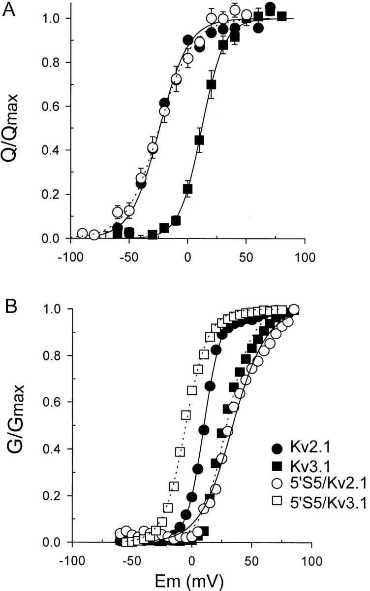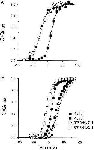 Figure 9. Voltage dependence of steady-state activation. Gating charge (A) was obtained from the time integral of Ion and was normalized to the maximal gating charge (Q max). Normalized charge was plotted versus test potential (Q-V) for Kv2.1 ( filled circles), 5′S5/Kv2.1 (open circles), and Kv3.1 ( filled squares). The conductance-voltage (G-V) relationship (B) was obtained by normalizing ionic conductances at each test potential by the maximal conductance. Normalized conductance was plotted for 5′S5/Kv3.1 (open squares), Kv2.1 ( filled circles), Kv3.1 ( filled squares), and 5′S5/Kv2.1 (open circles). Both Q-V and G-V data were fit to single Boltzmann functions (smooth curves). Data were pooled from >5 experiments (patches or oocytes, respectively, in A and B). For Kv2.1 the midpoint (V0.5) potentials were 10 and −25 mV, respectively for the G-V and Q-V curves, whereas V0.5 values for Kv3.1 were 20 and 0.9 mV. The midpoint of the Q-V curve for the 5′S5/Kv2.1 chimera was nearly identical to that of Kv2.1 (V0.5 = −22 mV), but the G-V curve (B; V0.5 = 22 mV) was shifted toward that of Kv3.1. The valence z for the gating charge (obtained from the slope of the Q-V curve) was the same in both Kv2.1 and the 5′S5/Kv2.1 chimera. |