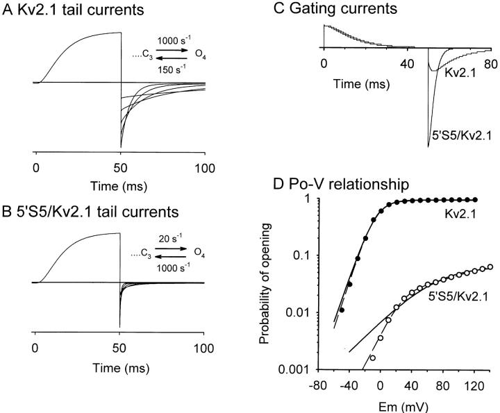 Figure 6. Numeric simulation of macroscopic currents in Kv2.1 and 5′S5/Kv2.1 using a sequential model. The effect of the mutation was assumed to be a destabilization of the open state caused by a sevenfold acceleration of the first closing step, O4→ C3, and a 50-fold slowing of the last opening step, C3→ O4. A and B show simulated tail currents, comparable to the actual records illustrated in Fig. 1. C and D show the predicted gating currents and Po-V relationships for the two channels. In D the smooth curves represent fits to single Boltzmann distributions with midpoint potentials (and slope factors) of −6 (11) and 68 (31.5) mV, respectively in Kv2.1 and 5′S5/Kv2.1. As indicated by the broken lines a better fit of the 5′S5/Kv2.1 data was obtained by using the sum of two Boltzmann distributions. |