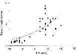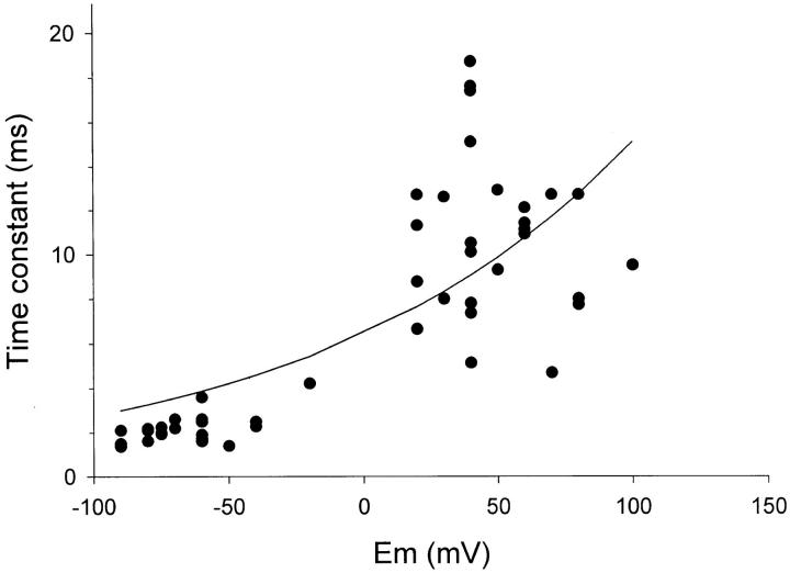 Figure 5. Voltage dependence of single channel open time in Kv2.1. Mean open times were estimated from the time constant obtained by fitting a single exponential to the open time histogram. Each histogram was constructed from >100 events in a patch at a given test potential, and each plotted point gives the time constant obtained from a single patch. Data were obtained in cell-attached patches exposed extracellularly to high [K+]o solution (either 120 or 60 mM). The solid line was fit according to the equation: where z = equivalent valence, 0.22 e− and τ0 = 6.4 ms. |