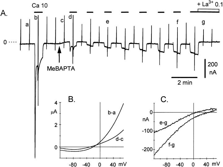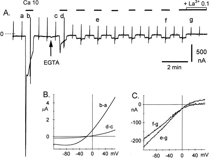 A monovalent cationic conductance that is blocked by extracellular divalent cations in Xenopus oocytes.