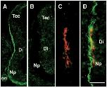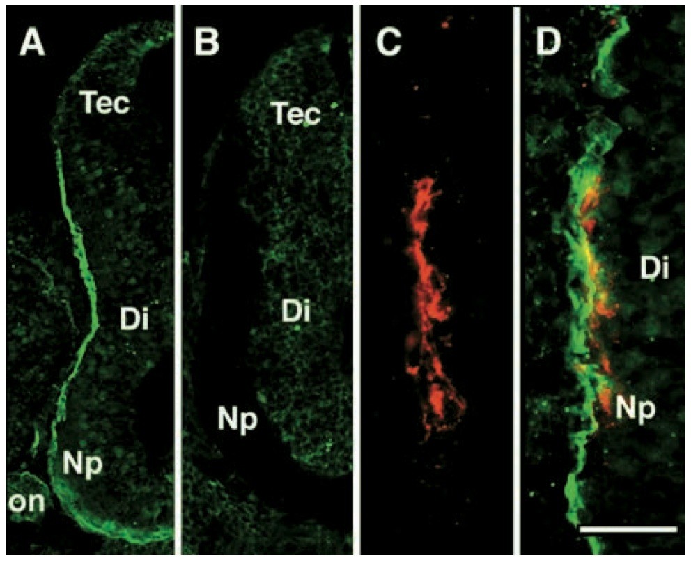Fig. 1. Pattern of native HS staining in the embryonic optic pathway. Confocal micrographs of transverse sections of the embryonic brain (left side) immunostained for HS using HepSS-1 antibody. (A) HS immunostaining is localized to a narrow band close to the pial surface of the diencephalon (Di) at stage 35/36 and is not present in the tectum (Tec). (B) Absence of HS staining following exposure of optic tract to heparitinase from stage 32 to 40. (C,D) Double immunolabeled section showing the earliest population of retinal ganglion cell axons (red) growing in the HS-rich region (green) close to the pial surface of the diencephalon. The rhodamine filter only was used in C. Np, neuropil; on, optic nerve. Dorsal is up, lateral is left. Scale bar, 100 μm (A,B) and 50 μm (C,D).