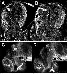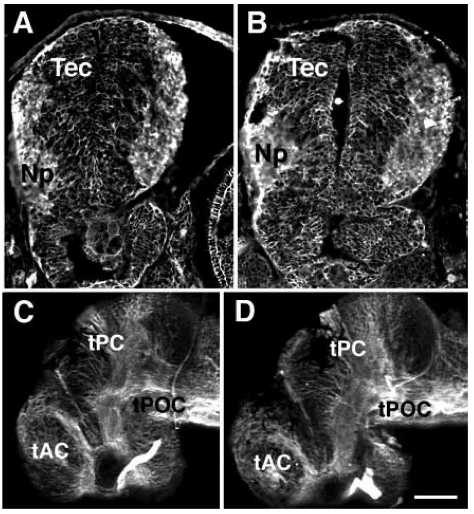 Fig. 5. Gross organization of neuroepithelium is unchanged by heparin treatment. Embryos were exposed to either control or heparin solutions (0.1 mg/ml) at stage 33/34 and examined at stage 40. (A,B) Confocal images of control (A) and heparin (B) treated brain sections stained with anti-NCAM. NCAM is abundant in the neuropil (Np) as well as in the neuroepithelium and is unaffected by heparin treatment. Tec, tectum, exposed side is to the left, dorsal is up. Scale bar, 50 μm. (C,D) Major axonal tracts are not changed by heparin treatment as seen with anti-acetylated tubulin staining in wholemount control (C) and heparin-treated (D) brains. tAC, tract of the anterior commissure; tPC, tract of the posterior commissure; tPOC, tract of the post-optic commissure. Dorsal is up, anterior to the left. Scale bar, 100 μm.