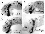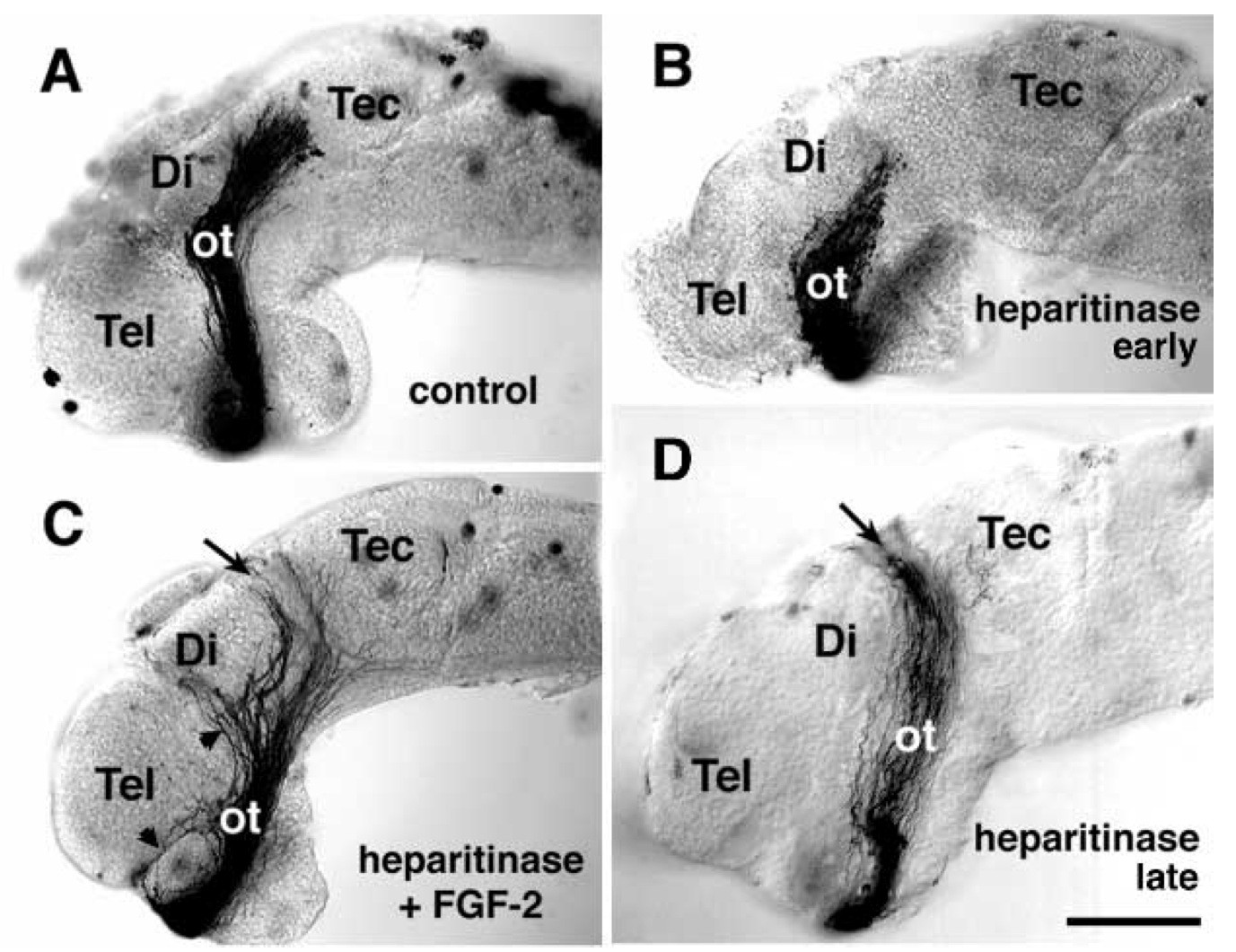 Fig. 6. Effects of enzymatic removal of native HS on retinal axon growth. (A) Control brain showing a normal optic projection at stage 37/38. (B) arlyheparitinase treatment during the period of axon extension through the optic tract, stage 32 to 37/38, causes abnormally short projections that fail to reach the tectum. (C) When FGF-2 (100 ng/ml) is added concomitant with heparitinase, the growth inhibition is alleviated and axons extend to normal lengths. However, many pathfinding errors occur with axons veering off the optic tract into the telencephalon and diencephalon (arrowheads) and axons bypass the tectum (arrow). (D) ateheparitinase treatment during the period of initial tectal invasion, stage 36/37 to 40, causes the bypass phenotype typical of defective target recognition. Tel, telencephalon; Di, diencephalon; Tec, tectum; ot, optic tract; arrows depict anterior border of the tectum. Scale bar, 200 μm.