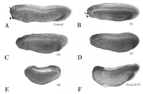 misexpress Xwnt-8 in the dorsal mesoderm (F) and then cultured to stage 13. Arrowhead in each panel marks the position of the yolk