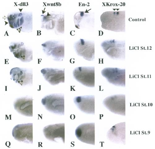structures are reduced or absent in the lithium-treated and Xwnt-8-misexpressing embryos. The scale of the extent of posteriorization