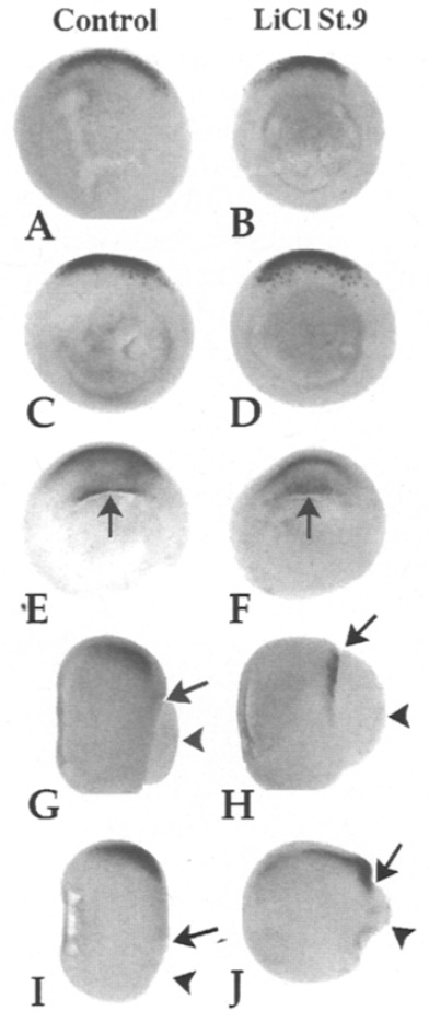 G, I) and embryos treated with lithium at stage 9 (B, D, F, H, J) were