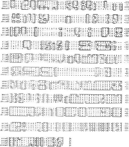 Fig. 1. Blocks 1–10: multiple nucleotide sequence alignment of XNcad1, XNcad2, XNcad3 and XBNcad3 using the GCG package. The first base of the initiation codon is numbered as +1. Bases conserved between the sequences are boxed. Bottom block: multiple amino acid sequence alignment of the proteins encoded by XNcad1, XNcad2, XNcad3 and XBNcad3 using the GCG package. The alignment begins from the initiating methionine. Amino acids conserved between the sequences are boxed.