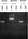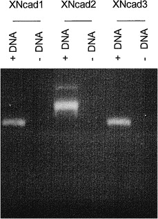 Fig. 2. PCR amplification of XNcad1, XNcad2 and XNcad3 sequences from the genomic DNA of an individual frog. Gene specific primers designed to the 5′ untranslated region of XNcad1,2 and 3 were used to amplify sequences from the genomic DNA of an individual frog. Bands of the predicted sizes were observed. No DNA controls were included for each set of primers.