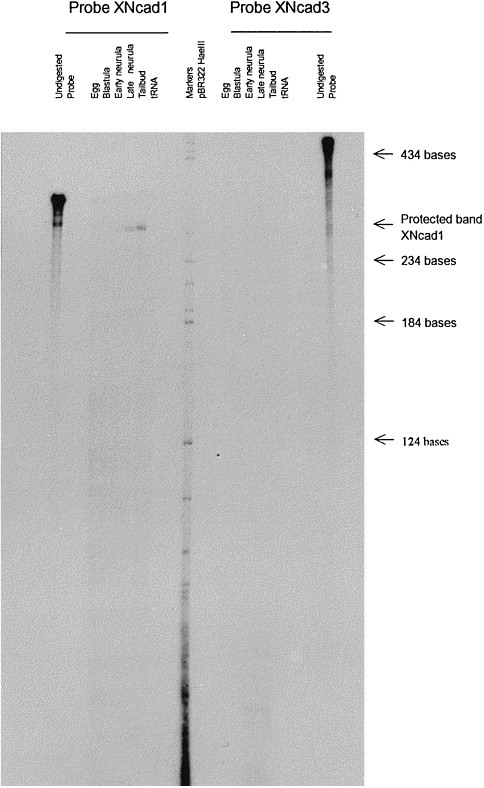Fig. 3. Expression of XNcad1 and XNcad3 in developing embryos. 20 μg of total RNA from a series of developing embryos were used in an RNase protection analysis with radiolabelled synthetic RNA gene specific probes as described in the text.