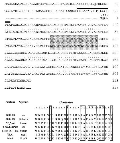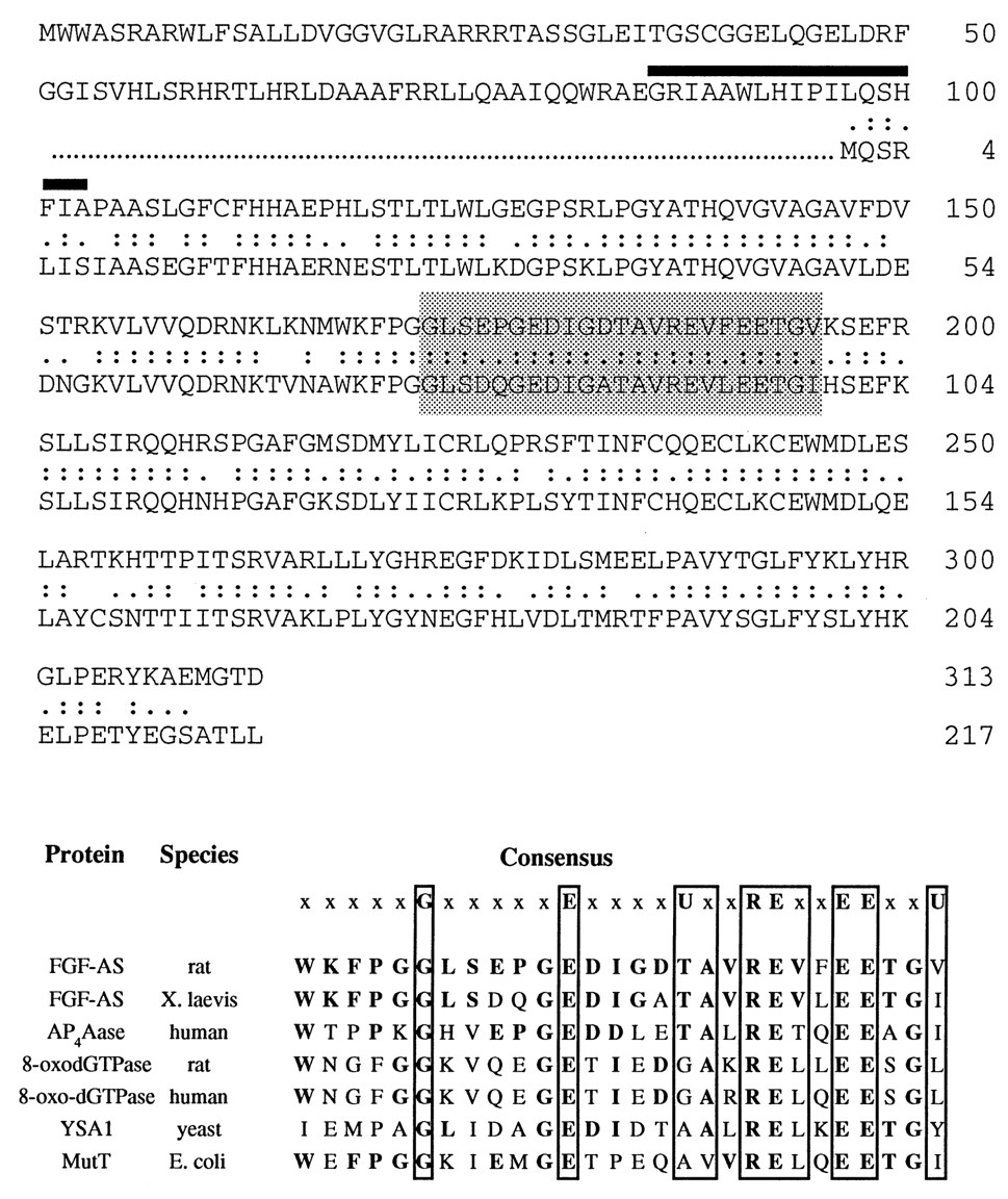 (Upper) Alignment of the deduced amino acid sequence of rat and Xenopus FGF-2 antisense cDNA clones. Double and single dots represent amino acid identity and similarity, respectively. Percentages of identity and similarity between rat and Xenopus antisense amino acid sequences are 69% and 89%, respectively. The location of a putative transmembrane domain (amino acids 89–107) is indicated by a heavy overline. The conserved MutT domain is shaded. (Lower) Comparison of the MutT domain and flanking sequence of the FGF-AS protein with those of other members of the MutT/Nudix family of proteins. In the consensus sequence (top line) U represents a bulky aliphatic amino acid (I, L, or V) and x may be any amino acid. Bold letters indicate identities with the rat FGF-AS protein sequence. The indicated sequences are P13420P13420 (Xenopus FGF-AS); U30313U30313 (human Ap4Aase); D49977D49977 and P36639P36639 (rat and human 8-oxo-dGTPase); Q01976Q01976 (yeast YSA1); and P08377P08377 (Escherichia coli MutT).