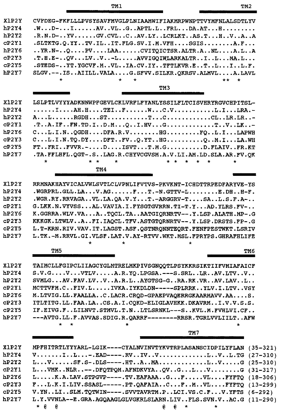 Extracellular ATP functions as a neurotransmitter and neuromodulator in the adult nervous system, and a signaling molecule in non-neural tissue, acting either via ligand-gated ion channels (P2X) or G-protein-coupled receptors (P2Y). ATP can cause an increase in intracellular Ca2+ (Ca2+i) in embryonic cells and so regulate cell proliferation, migration, and differentiation. We have isolated a Xenopus cDNA encoding a novel P2Y receptor, XlP2Y, which is expressed abundantly in developing embryos. Recombinant XlP2Y responds equally to all five naturally occurring nucleoside triphosphates (ATP, UTP, CTP, GTP, and ITP), which elicit a biphasic Ca2+-dependent Cl- current (ICl,Ca) where the second phase persists for up to 60 min. XlP2Y also causes a continuous release of Ca2+i and a low level persistent activation of ICl,Ca in Xenopus oocytes through the spontaneous efflux of ATP. mRNAs for XlP2Y are expressed transiently in the neural plate and tailbud during Xenopus development, coincident with neurogenesis. This restricted pattern of expression and novel pharmacological features confer unique properties to XlP2Y, which may play a key role in the early development of neural tissue.