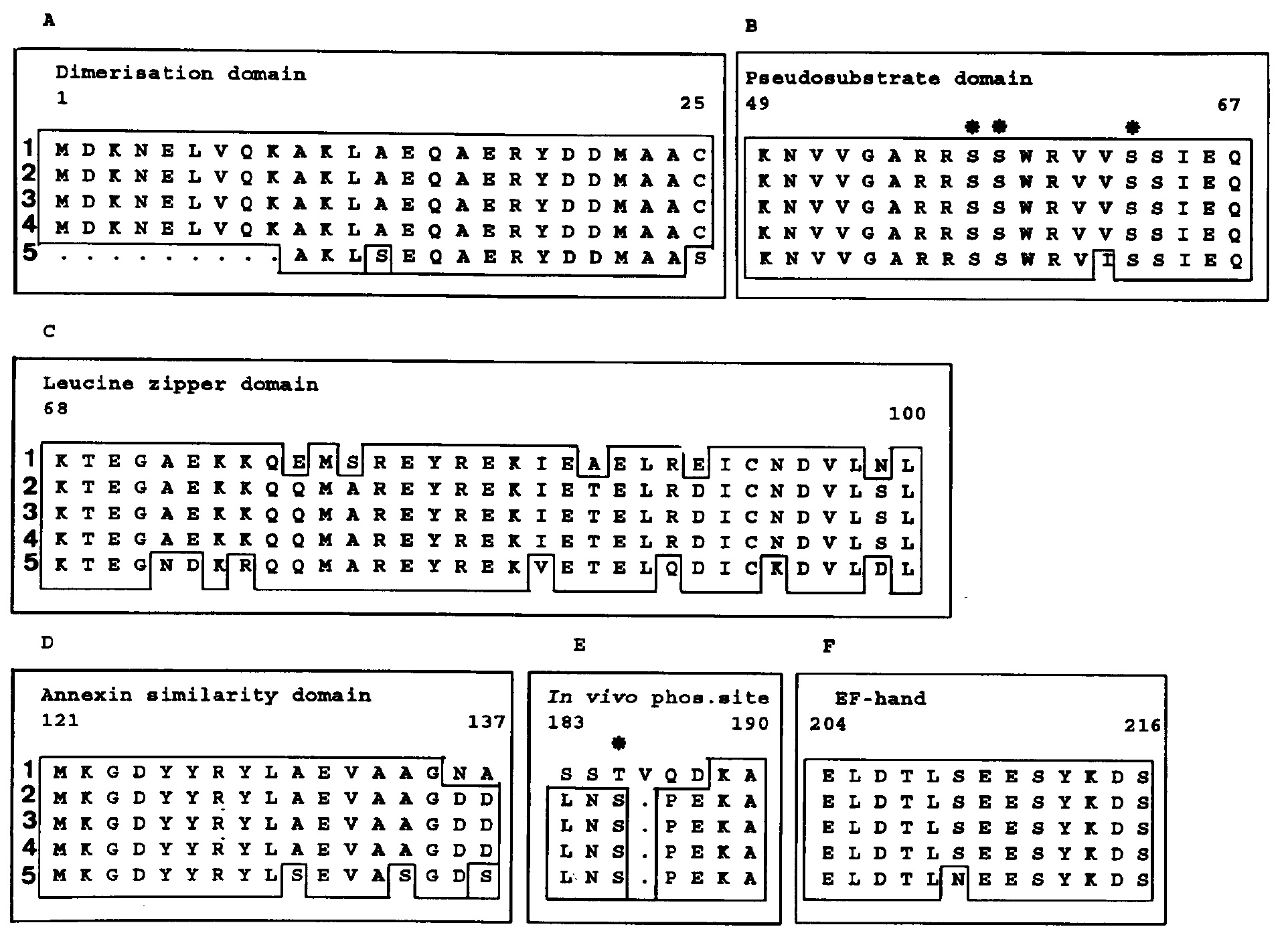 Fig. 2. Alignment of the aa sequence of the six putative domains (A-F) in x14-3-3~ with other characterised members. The sequences compared