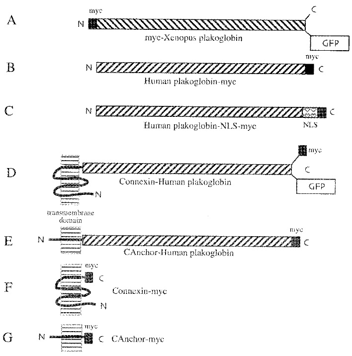 FIG. 1. A cartoon of the constructs used in this work. Xenopus plakoglobin (A) was tagged at its N-terminus with either a myc-epitope (myc) or a mutated (super) form of green fluorescent protein (GFP). Human plakoglobin (B) was tagged at its C-terminus with myc. Alternatively, a NLS was inserted between the plakoglobin and myc sequences to form HPkg-NLS-myc (C). Two types of mem-brane-anchored forms of HPkg were constructed. The transmembrane domain of rat connexin-32 was fused in-frame to the HPkg-myc sequence to form CnxHPkg-myc (D). A form of CnxHPkg in which