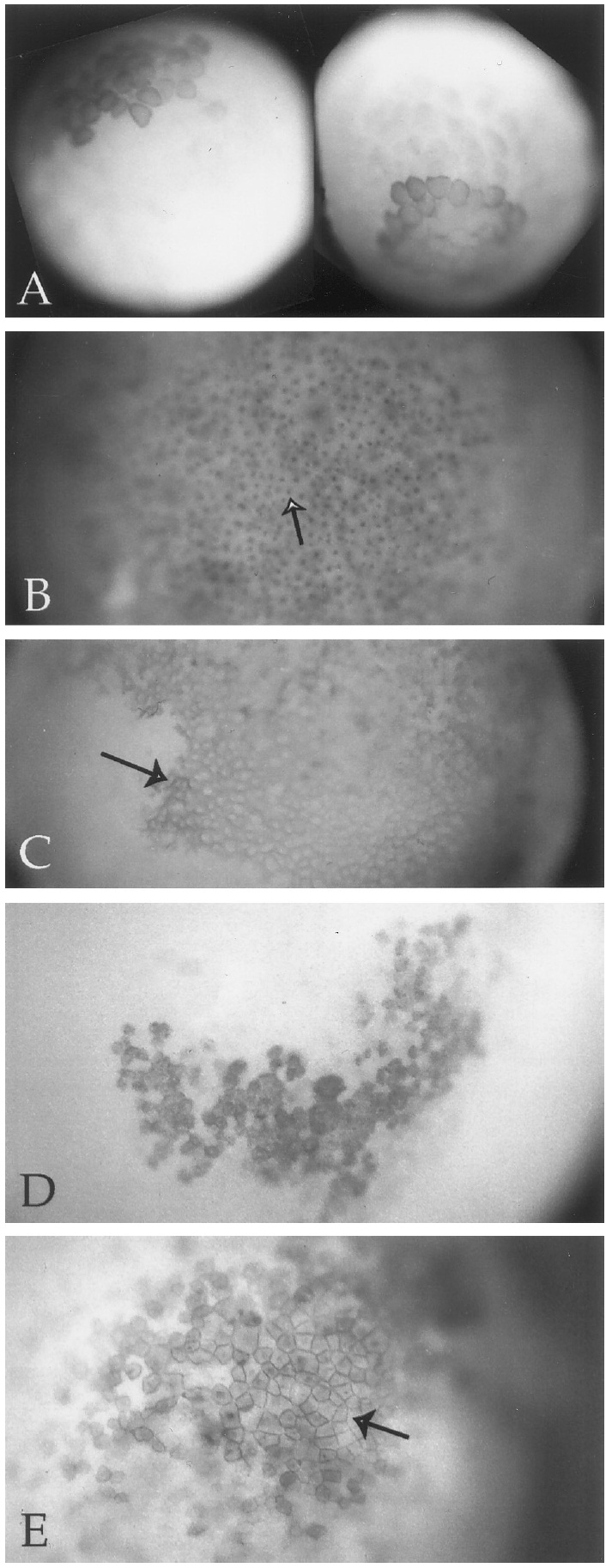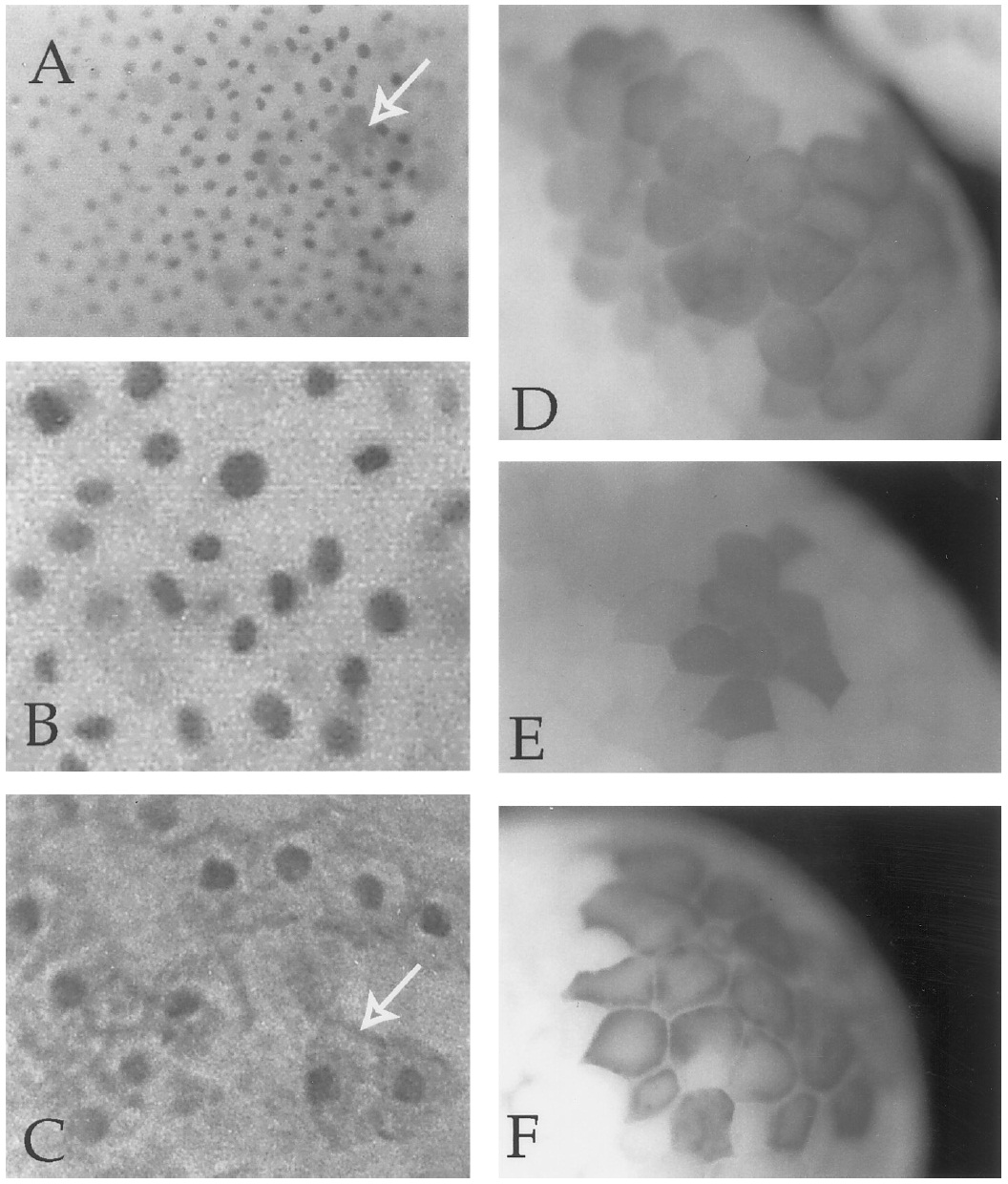 embryos, the only cells with apparently cytoplasmic staining (A) lack discrete nuclei (arrow) and appear to be in mitosis. In