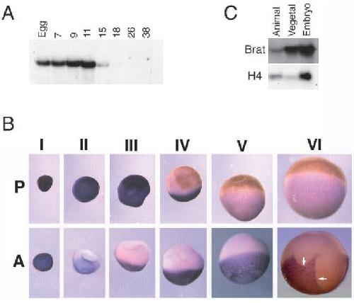unstained cytoplasm. (C) Vegetal localization of Brat mRNA in early