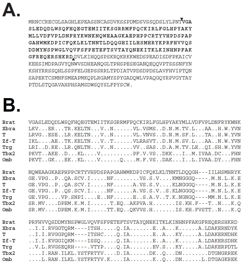the arrows and is highlighted in bold. (B) A comparison of the T domain of Brat with