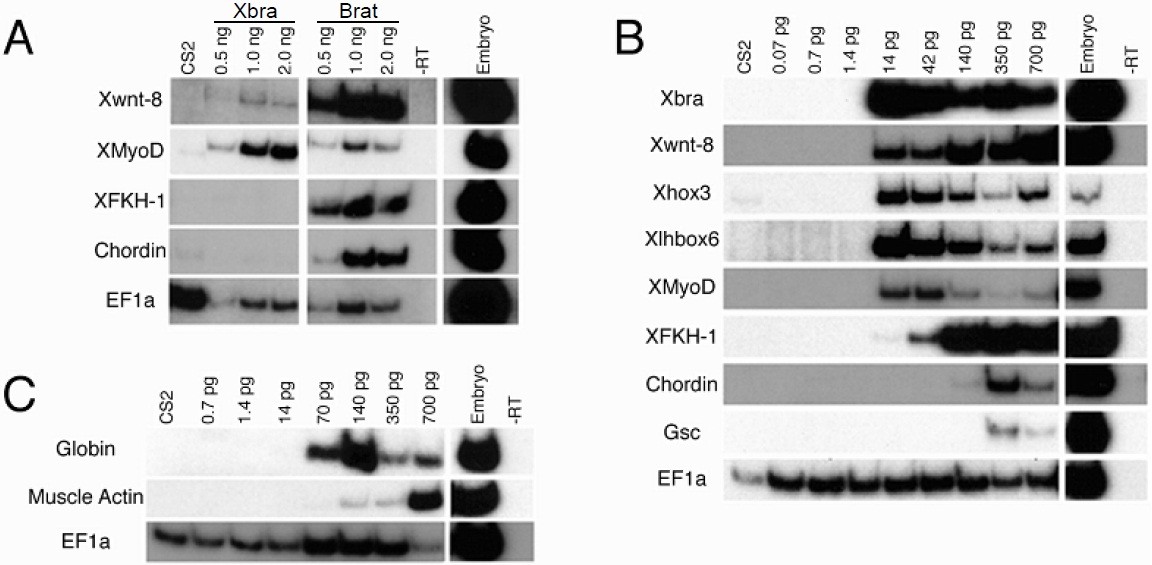 goosecoid (gsc) (Cho et al., 1991) and chordin at higher doses (350-700 pg). (C) In tadpole stage 28 animal caps Brat induces globin, a marker