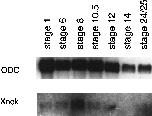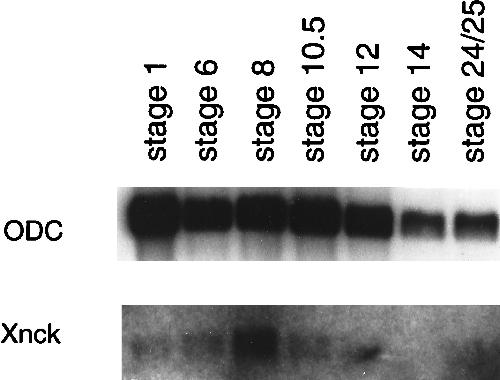 Figure 1 Xenopus Nck mRNA expression during embryonic development. Equal amounts of poly(A)+ RNA extracted from embryos at stage indicated above were loaded in each lane and blot was hybridized to full-length Xenopus Nck cDNA probe. Hybridization with ornithine decarboxylase (ODC) riboprobe (Top) is a control for RNA loading.