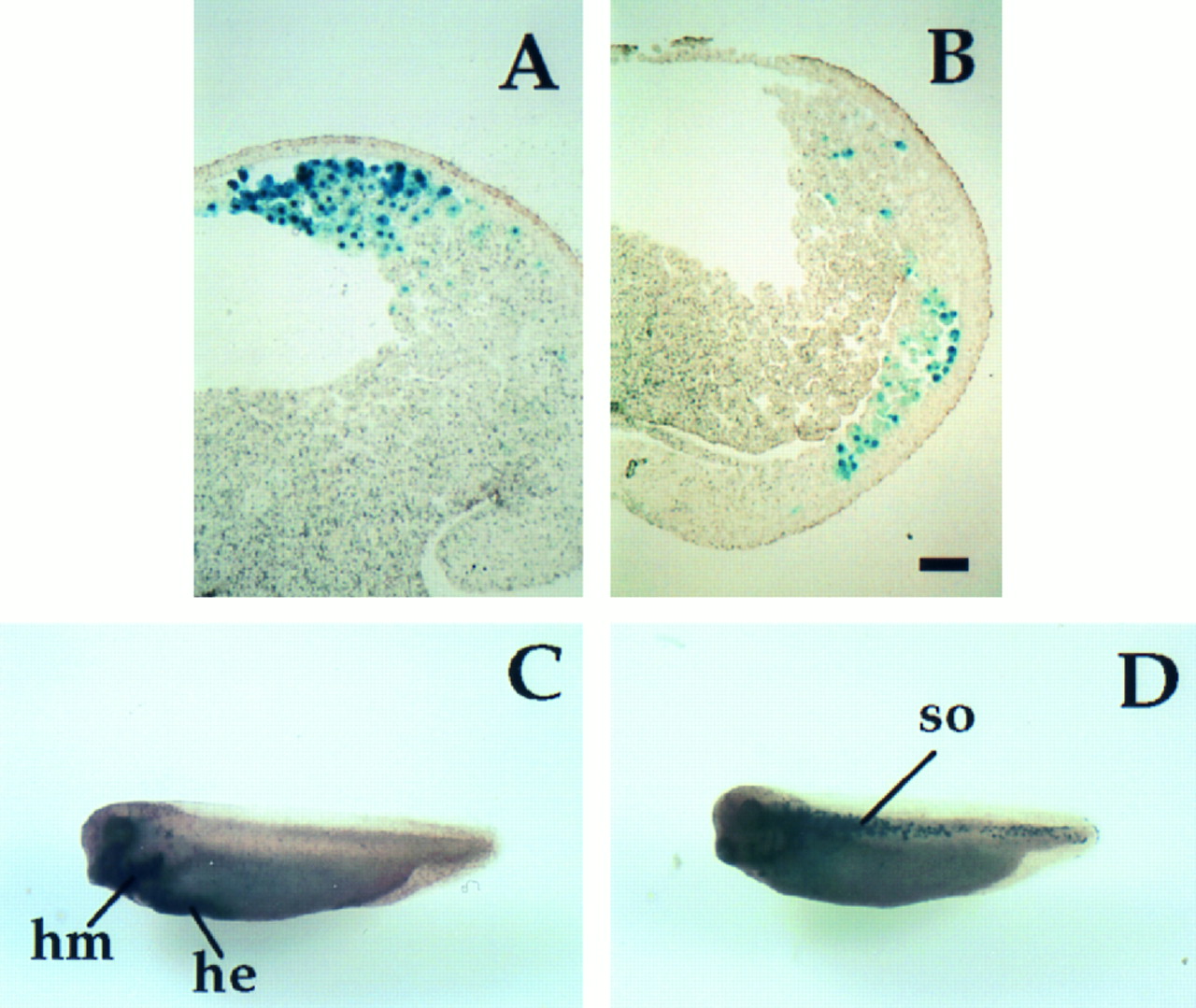Figure 5 Nck K229 disrupts migration of mesoderm cells. mRNA (0.1 ng) encoding nuclear-localized β-galactosidase plus 0.2 ng of either KALL control (A and C) or K229 (B and D) mRNA was injected into C1 blastomeres of 32-cell embryos. Embryos were fixed and stained with X-Gal at stage 12 (A and B) or stage 30 (C and D). (A and B) Embryos are positioned with animal pole at top and dorsal side to the right. (Bar = 100 μm.)