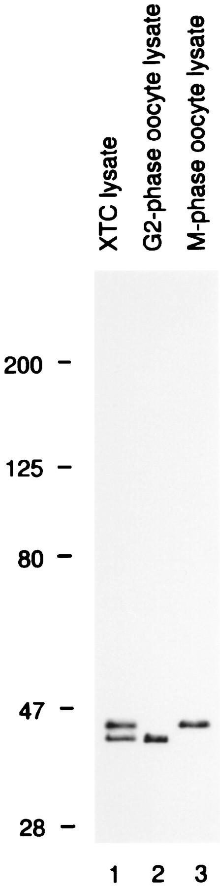 Figure 1. The specificity of antibody X15. Immunoblots of lysates from XTC cells (lane 1), G2-phase oocytes (lane 2), and M-phase oocytes (lane 3) were probed with X15. XTC cells exhibited two bands: a lower band that comigrated with nonphosphorylated Erk2, and an upper band that comigrated with both Erk1 and phosphorylated Erk2. The upper band was identified as Erk1, rather than phosphorylated Erk2, based on its cross-reactivities with other Erk1 and Erk2 antisera, and on the fact that it did not shift to a lower apparent molecular weight when lysates were treated with XCL100 (not shown).