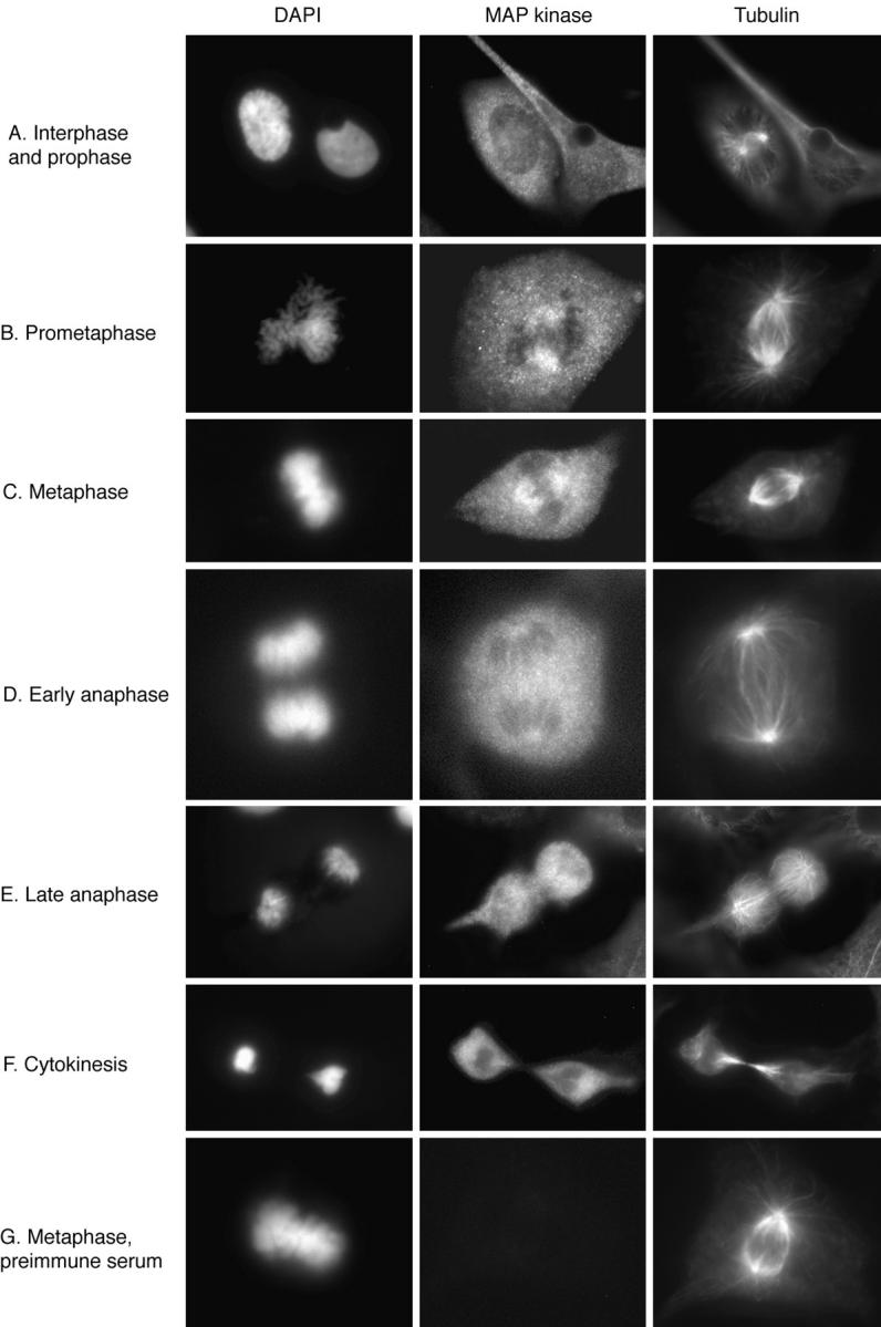 Figure 2. Immunolocalization of MAP kinase at different mitotic stages. XTC cells were fixed, permeabilized, and subjected to triple label staining with DAPI, X15, and a β-tubulin antibody (A–F), or with DAPI, X15 preimmune serum, and the tubulin antibody (G).