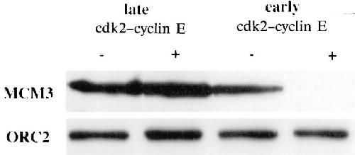 Figure 3. High concentration of cdk2–cyclin E doesn't inhibit ORC2 from binding to chromatin. 500 nM of cdk2–cyclin E was added either before (early cdk2–cyclin E) or 30 min after (late cdk2– cyclin E) sperm addition. Chromatin fractions were extracted with ELB containing 0.1% NP-40 and spun through a sucrose cushion containing 0.1% NP-40. The pellet fractions were analyzed for MCM3 and ORC2 content by Western blotting with specific antibodies. MCM3 binding to chromatin is inhibited by early addition of cdk2–cyclin E, while ORC2 binding is unaffected.