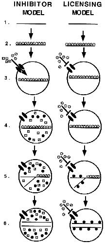Figure 7. Comparison between the inhibitor and licensing models. In the inhibitor model, proteins required for potentiating DNA replication (shaded circles) bind to DNA when cdk2 activity is low. In Xenopus eggs this occurs at the end of mitosis before nuclear formation, when cdk2–cyclin E activity is dilute (1 and 2). In somatic cells this would occur during early G1 when cdk2–cyclin E is inactive. After nuclear formation, cdk2–cyclin E (black squares) is rapidly transported into nuclei and accumulates (4). Replication potentiating proteins which enter the nucleus (black circles) are prevented from associating with DNA due to the high nuclear concentration of cdk2–cyclin E. However, the nuclear cdk2 does not displace potentiating proteins which are prebound to DNA. Similarly in somatic cells, activation of nuclear cdk2–cyclin E or A kinases during late G1 would block any further potentiation of DNA for replication. During DNA replication the potentiating proteins are displaced from DNA and prevented from rebinding DNA by the presence of high concentrations of cdk2 kinase activity (5 and 6). In the licensing model, proteins (shaded circles) required for DNA replication associate with DNA at the end of mitosis (1 and 2). Because these proteins cannot enter the nucleus, enclosure of the DNA within the nucleus blocks further licensing (3 and 4). As a result of DNA replication the licensing proteins are converted to an inactive state (5 and 6).