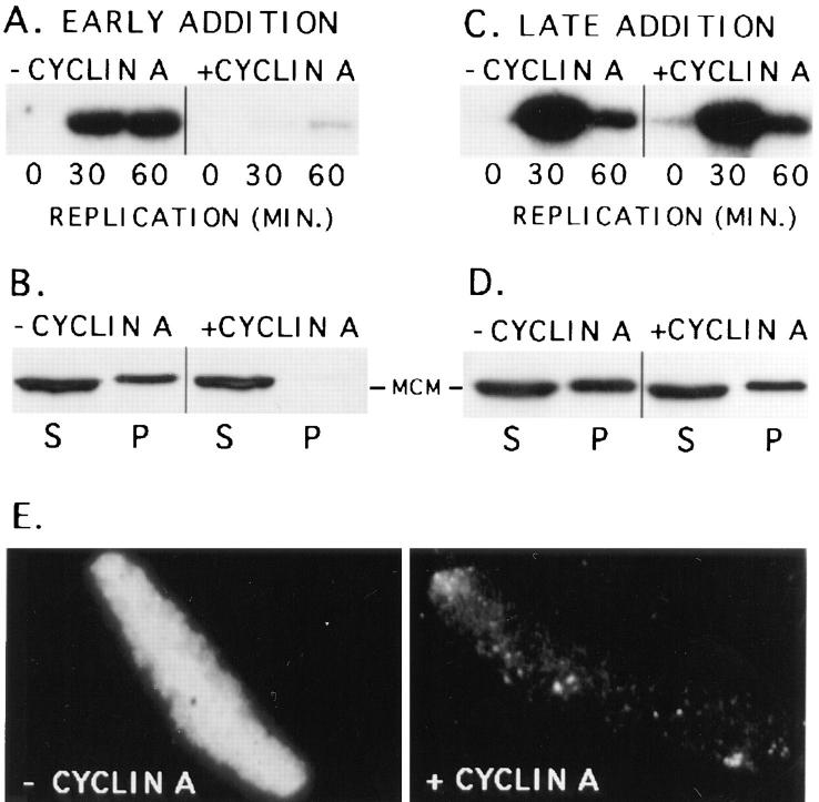 Figure 6. Cyclin A inhibits MCM3 binding to chromatin and blocks DNA replication. (A) Interphase cytosol was preincubated alone (− CYCLIN A) or with 66 nM of cyclin A–GST fusion protein for 30 min. After this preincubation, membrane and sperm (1,000 sperm/μl) were added. Equal volumes of these extracts were removed at the indicated times and labeled with [32P]dATP for 15 min. In extracts lacking added cyclin A, replication occurred normally, while in the presence of cyclin A replication was strongly inhibited. (B) Interphase cytosol was preincubated with or without 66 nM of cyclin A-GST for 30 min. Sperm nuclei were then added to 5,000 sperm/μl. After a further 30-min incubation, the samples were diluted fivefold with ELB and the sperm chromatin separated from the cytosol by centrifugation through a sucrose cushion. The cytosol (S) and chromatin (P) fractions were analyzed for MCM3 content by Western blotting with antiMCM3 antibody. Preincubation of cytosol with cyclin A strongly inhibited the subsequent association of MCM3 with chromatin. (C) Interphase cytosol was first incubated with 1,000 sperm/μl for 30 min. This reaction was then divided in half, and 66 nM cyclin A was added to one aliquot (+ CYCLIN A). Membrane was then added to both halves, and DNA replication was assayed as in (A). Under these conditions cyclin A did not inhibit DNA replication. (D) Interphase cytosol was incubated with 5,000 sperm/μl for 30 min. Either ELB buffer (− CYCLIN A) or 67 nM of cyclin A-GST (+ CYCLIN A) was then added to the reactions. After a further 30-min incubation, samples were collected and analyzed as in B. Under these conditions late addition of cyclin A did not prevent MCM3 from binding to sperm chromatin. (E) The samples were treated as in B above, however, instead of pelleting the sperm after incubation, the chromatin-bound MCM3 was visualized by staining with anti-MCM3 antibody, followed by rhodamine-labeled anti–rabbit IgG. Early addition of cyclin A (+ CYCLIN A) blocked the association of MCM3 with chromatin when compared to controls lacking cyclin A (− CYCLIN A).