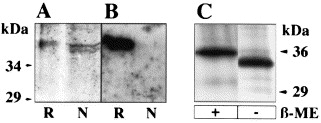 Fig. 3. (A) Purified fiz protein in Coomassie-stained SDS-PAGE. R denotes recombinant protein produced in CEF cells. Native protein as purified from BHK cells is marked N. (B) Western blot of samples in (A). The blot was probed with the rabbit polyclonal antiserum SA1804 specific for the mouse fiz (R) protein. The hamster fiz protein (N) did not react. (C) Silver-stained SDS-PAGE of purified BHKfiz protein. Samples were treated with (+) and without (−) β-mercapto-ethanol.