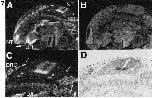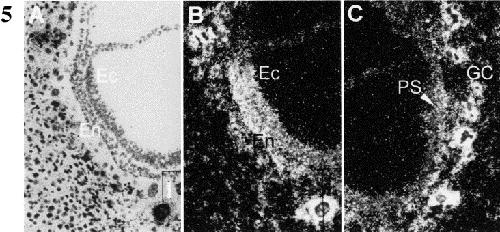 Fig. 5. Localization of mouse fiz mRNA in 7.5 dpc embryos. (A) Bright field illumination showing a sagittal section of the anterior region of a 7.5 dpc mouse embryo in the maternal decidua hybridized with 35S-labelled mfiz antisense RNA probe. (B) Dark field image of (A). (C) Dark field image of primitive streak area of the embryo. Abbreviations: Ec, ectoderm; En, endoderm; GC, giant cell; PS, primitive streak. Bar represents 40 μm.