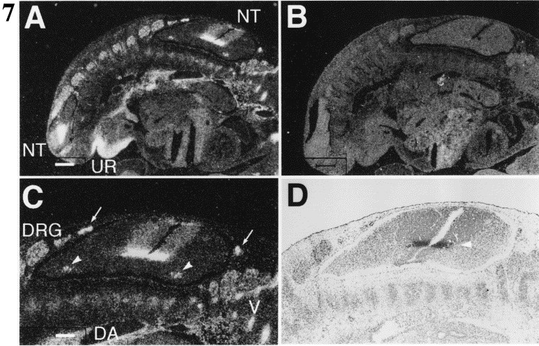 Fig. 7. Localization of mouse fiz mRNA in 11.5 dpc embryos. (A) Dark field illumination of a sagittal section of a 11.5 dpc mouse embryo hybridized with 35S-labelled mfiz antisense RNA probe. (B) Dark field image of a parallel section probed with mfiz sense RNA. (C) Enlargement of the neural tube area in (A). Glial cells ensheathing dorsal roots and cells in the ventral area are marked by arrows and arrowheads, respectively. (D) Bright field image of (C). A stripe of mfiz mRNA-expressing cells in the medial region of the neural tube is marked by an arrowhead. Abbreviations: DA, dorsal aorta; DRG, dorsal root ganglion; NT, neural tube; UR, urogenital ridge; V, vertebra. Bars represent 80 μm in (A,B) and 40 μm in (C,D).