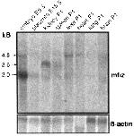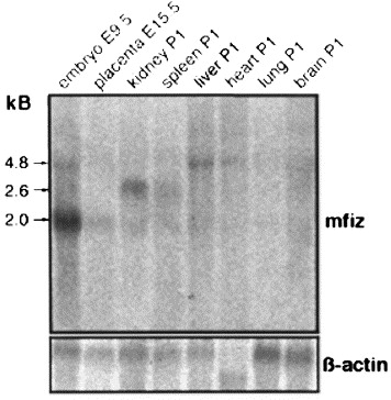 Fig. 9. Northern blot of mouse tissues at different stages of development. Total RNAs of postnatal tissues as well as RNAs of 9.5 dpc embryos and 15.5 dpc placenta were used. Arrows indicate a prominent transcript at 2.0 kb and transcripts of minor abundance of 2.6 and 4.8 kb. Blots were probed with 32P-labelled mfiz cDNA and reprobed with 32P-labelled β-actin cDNA for normalization.