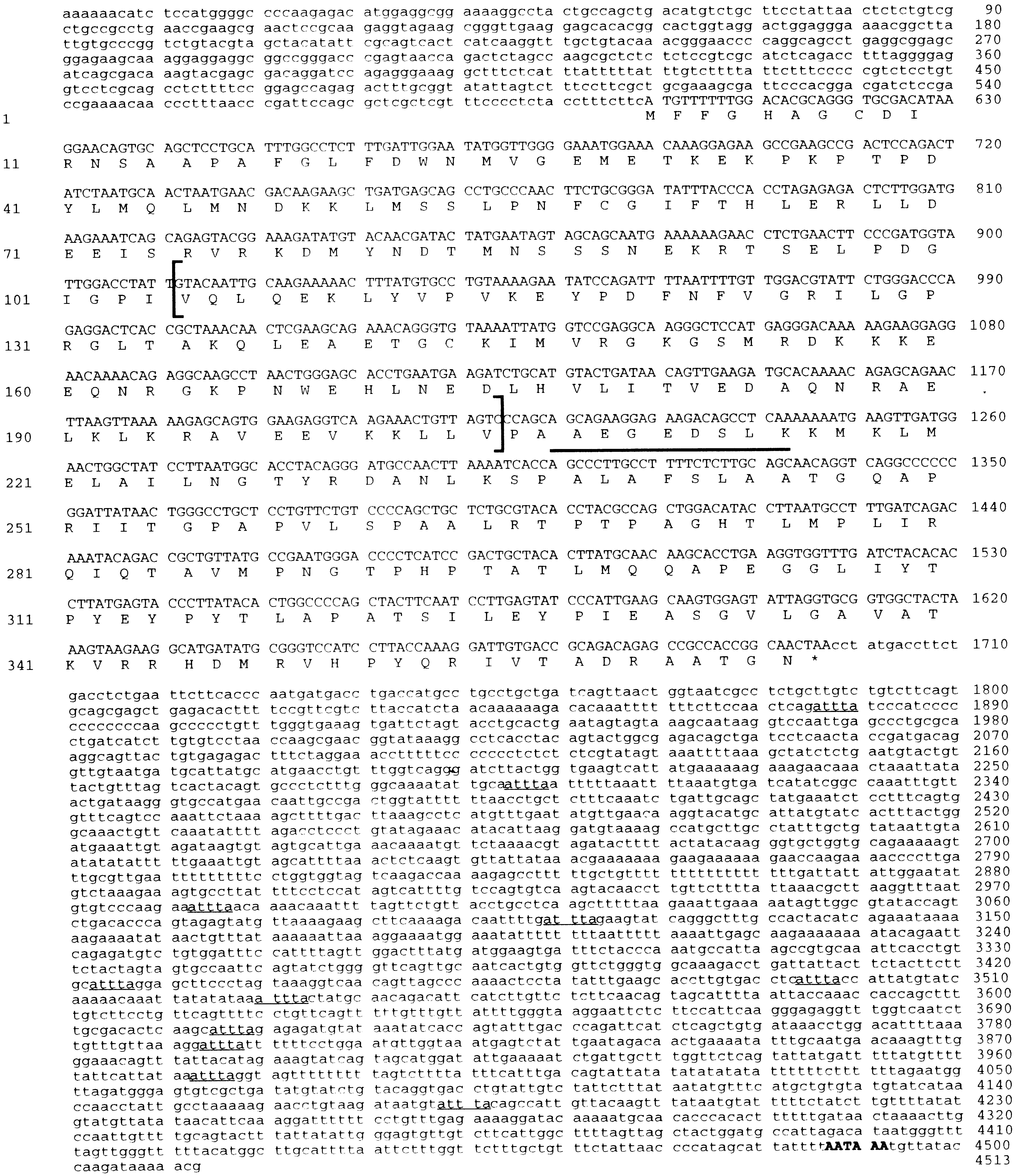 Full length Xqua cDNA sequence. The 5′ and 3′ UTR sequences (in lower case) are 599 nt and 2819 nt long respectively, with an ORF of 1095 nt (in upper case). The conceptual translation of the ORF is presented below. The extended KH domain is contained in parentheses. The 24 nt alternatively spliced sequence has a bold line over it. The 3′ UTR contains eleven putative mRNA destabilizing sequences, AUUUA ( Shaw and Kamen, 1986; Wilson and Treisman, 1988), which are underlined. A polyadenylation signal sequence (AAUAAA) is indicated in bold upper case. Clones containing Xqua sequences were initially identified using a 1.1 kb fragment of the mouse qkI coding region to probe 106 clones from a stage 30 Xenopus head cDNA library ( Hemmati-Brivanlou et al., 1991). Hybridizations were performed in 40% formamide, 1 M NaCl, 1% SDS, 50 mM Tris-HCl (pH 7.6), 5×Denhardt's and 100 μg/ml herring sperm DNA, at 42°C. Filters were washed at moderate stringency, in 2×SSC/0.1% SDS at 55°C. Exonuclease III digestion (Erase-a-Base, Promega) was used to make nested deletions of overlapping Xqua cDNA clones and sequence was determined by chain-termination sequencing ( Sanger et al., 1977) of both strands of the Xqua cDNA. |