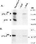 pXqua binds RNA in vitro. Binding of (A) pXqua357 and (B) pXqua365 to RNA in vitro. Synthetic mRNA encoding pXqua357 or pXqua365 was translated in vitro in reticulocyte lysates in the presence of [35S]methionine. An amount equal to 20% of the protein(s) used in each binding reaction is shown in the track marked translation. 35S-labeled proteins were bound to 30 μg of total Xenopus embryonic RNA-agarose (track labeled +RNA) in buffer containing 100 mM NaCl. As a control, an equal amount of protein was bound to agarose beads that were not coupled to RNA (track labeled −RNA). After extensive washing, protein retained on the RNA-agarose was analyzed by SDS-PAGE using a 12.5% gel and visualized by fluorography. The control CAT protein did not bind to the RNA-agarose. To generate labeled protein for RNA-binding studies, sequences encoding pXqua357 and pXqua365 were inserted into pT7TS vector (a modified version of pSP64T, Krieg and Melton, 1987). pT7TS-Xqua templates were linearized with BamHI and capped mRNA was produced using the Ambion Message Machine kit. Approx. 100 ng of synthetic mRNA encoding pXqua357, pXqua365 or pCAT (control sequence provided by BRL) was translated in vitro in the presence of [35S]methionine, using reticulocyte lysate (Ambion). To generate RNA-agarose, total Xenopus embryonic RNA at 1 mg/ml in water was biotinylated using photo-activated biotin-acetate (Vector Labs) according to the manufacturer's instructions. The RNA-biotin was then mixed with streptavidin-agarose resin (BRL) to a final concentration of 1–2 μg of RNA per 1 μl of agarose resin. RNA binding of in vitro translated proteins was assayed essentially as described by Swanson and Dreyfuss (1988)using approx. 105 dpm of labeled protein and 30 μl RNA-agarose resin. Proteins bound to the RNA-agarose were released by addition of SDS-protein loading buffer, boiled, and then resolved by SDS-PAGE and visualized by fluorography. In each experiment, control binding reactions were carried out with streptavidin-agarose (inactivated) that was not coupled to RNA. |