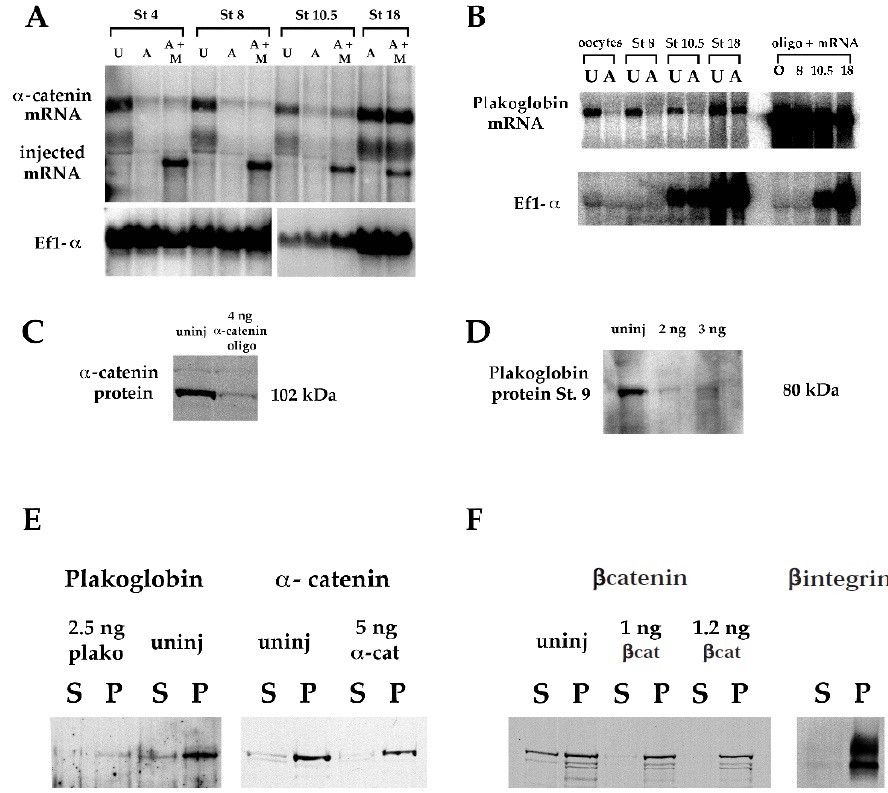 2.5 and 3 ng of oligo M7 (D). The blots were probed with a-catenin (C) and plakoglobin (D) antibodies (see Materials and Methods). (E,F)